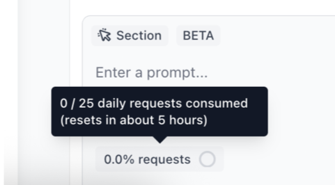 Your workspace and publication include a set number of daily AI requests based on your plan type and tier. A credit counter at the bottom of the prompt box shows how many credits you have remaining, and when your credits will reset for the day. Each AI prompt counts toward your daily shared workspace allowance.