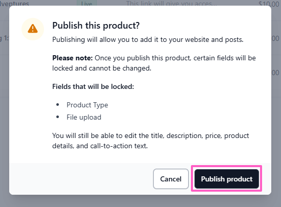 - When publishing, you’ll be asked to confirm your choice. Once a product is published, certain fields become locked and cannot be edited (including product type, files, and connected calendars).