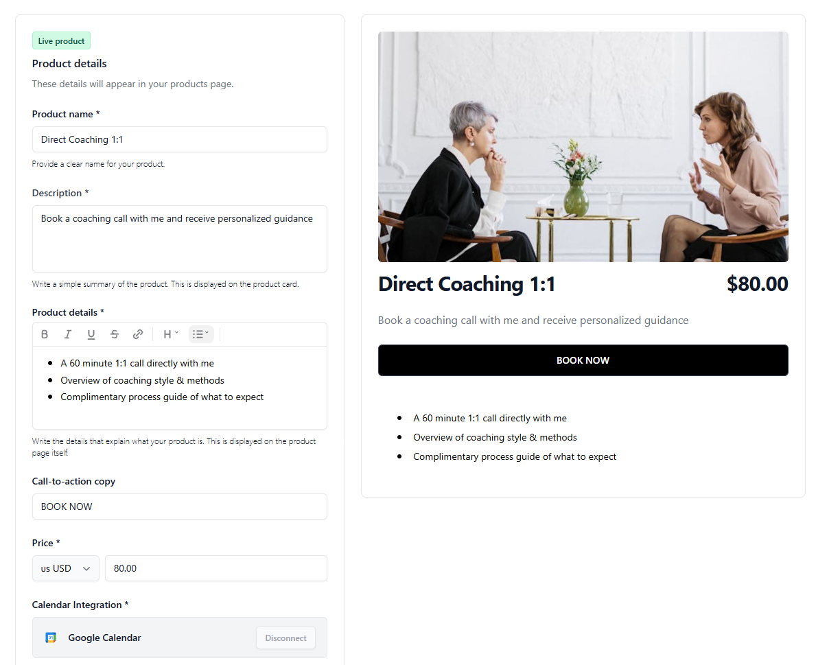 - Calendar integration (coaching products): (Max and Enterprise plans) Connect your calendar, then set Session duration (minutes) and Booking window (days).