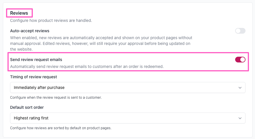Choose when review request emails are sent — Immediately after purchase, 24 hours after order is redeemed, or 48 hours after order is redeemed. -