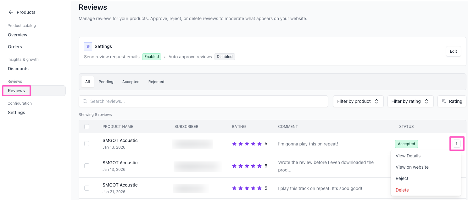 Once customers begin submitting reviews, you can manage them from the Reviews section in your Products dashboard.