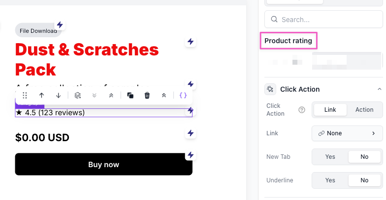 You can also highlight your product rating near the price. To do this, insert the Rating block above your price on the canvas.