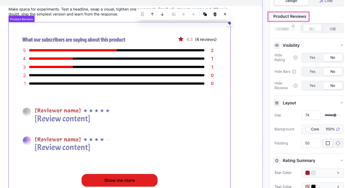 From the Website Builder, navigate to your Product page, then click on the Product Reviews block to view and update its available styling options in the right panel.